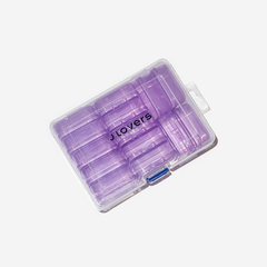 Внешние размеры 15*11*6см, 14 контейнеров размерами 2*5,3см, глубина 1,7см, прозрачный пластик. Контейнеры розового цвета не соединены между собой, каждый имеет индивидуально защелкивающуюся крышку.