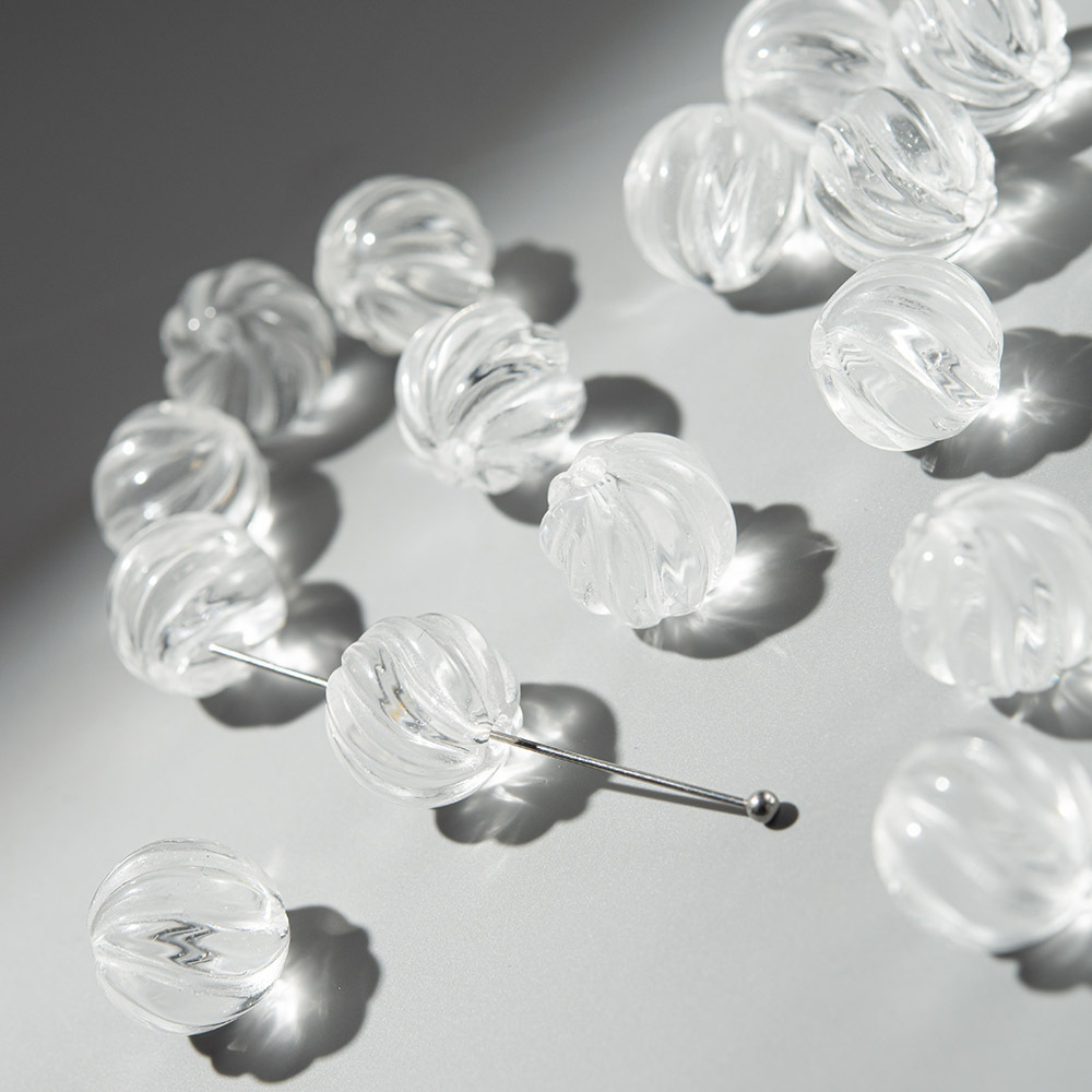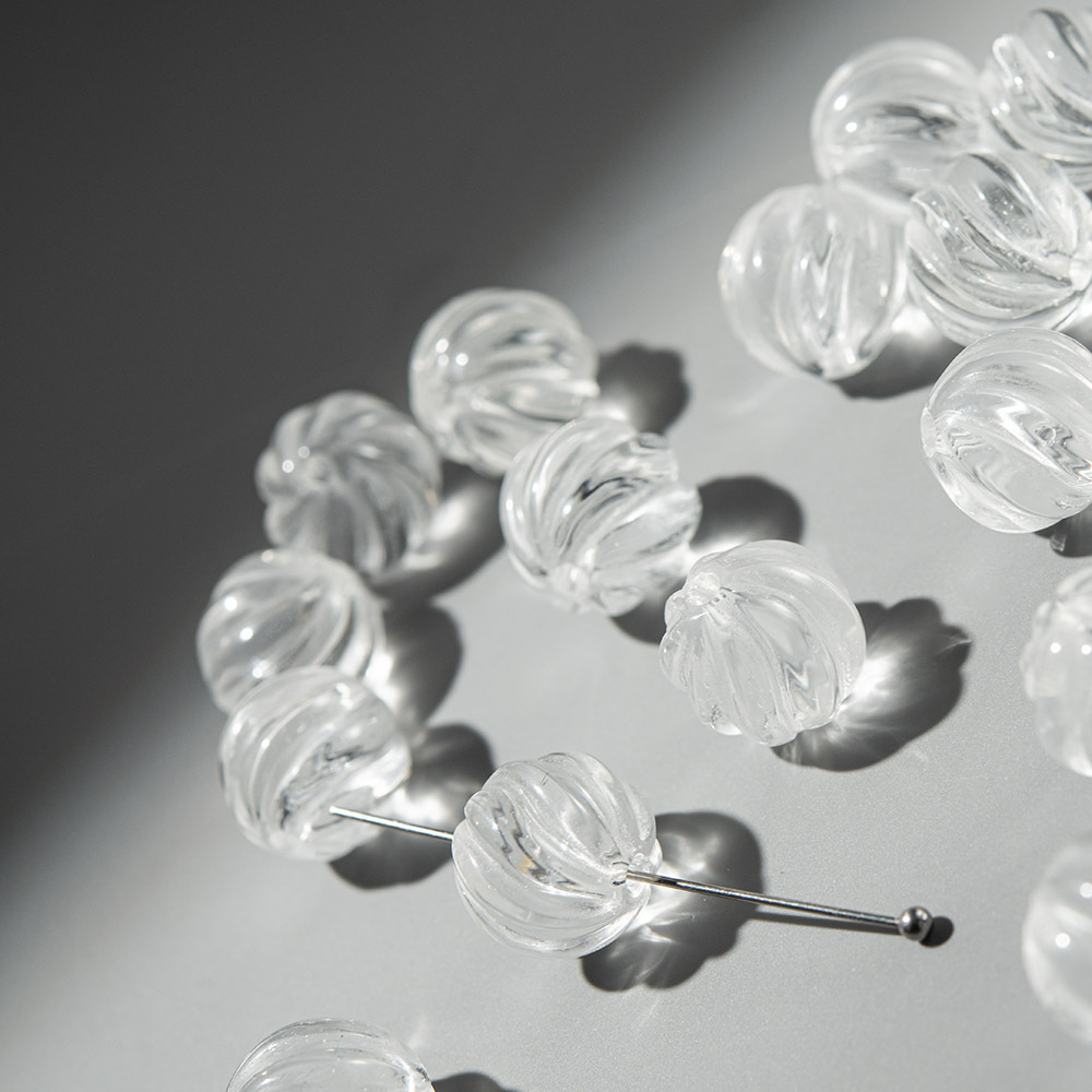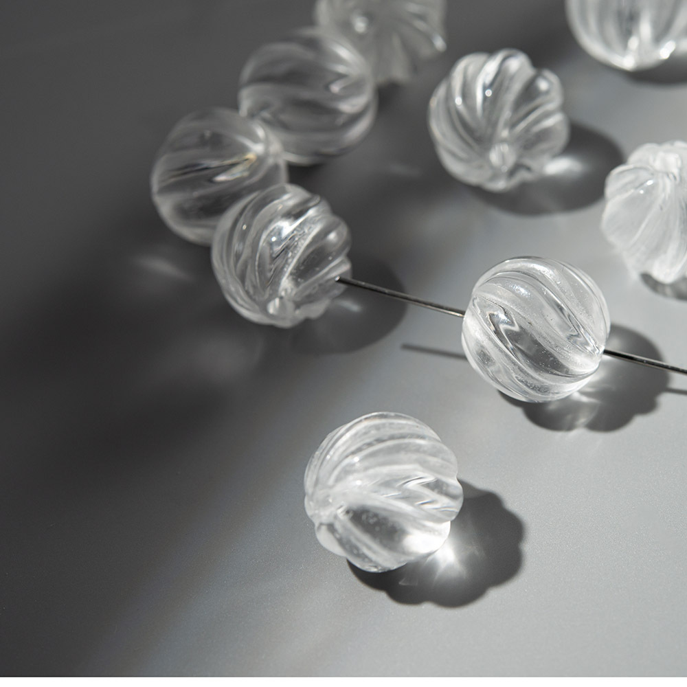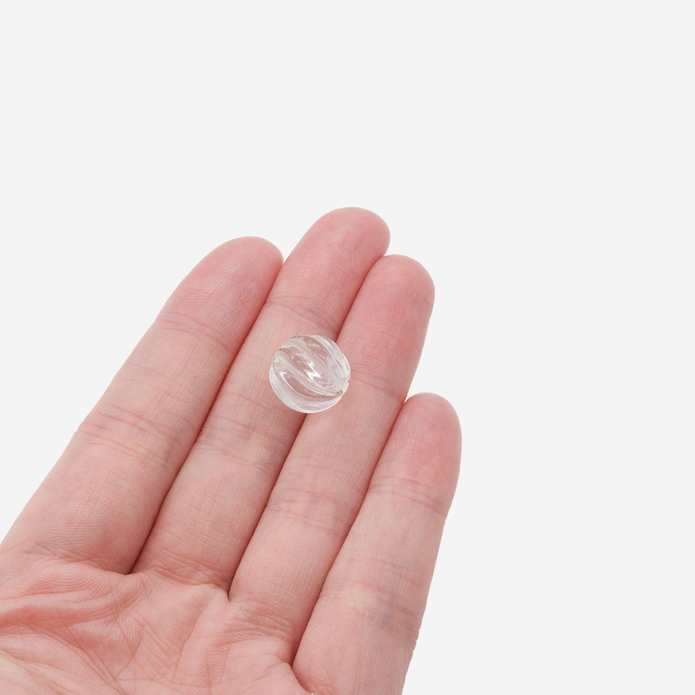 Круглая бусина с рифлением из натурального горного хрусталя с включениями слюды и других минералов. Отверстие 1,5мм.
