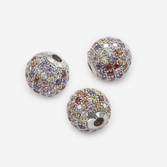 Бусина имеет диаметр 10 мм, отверстие 1,7мм, позолота, украшена разноцветными фианитами.