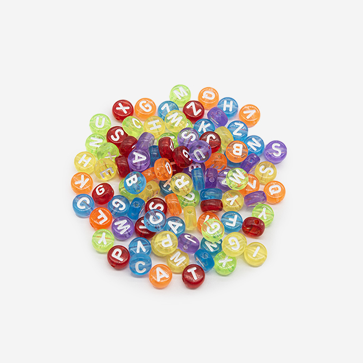 Круглые разноцветные полупрозрачные бусины с белыми буквами английского алфавита из акрила с боковым отверстием 1,5мм, микс цветов. Размер 6,7мм, толщина 3,8мм.