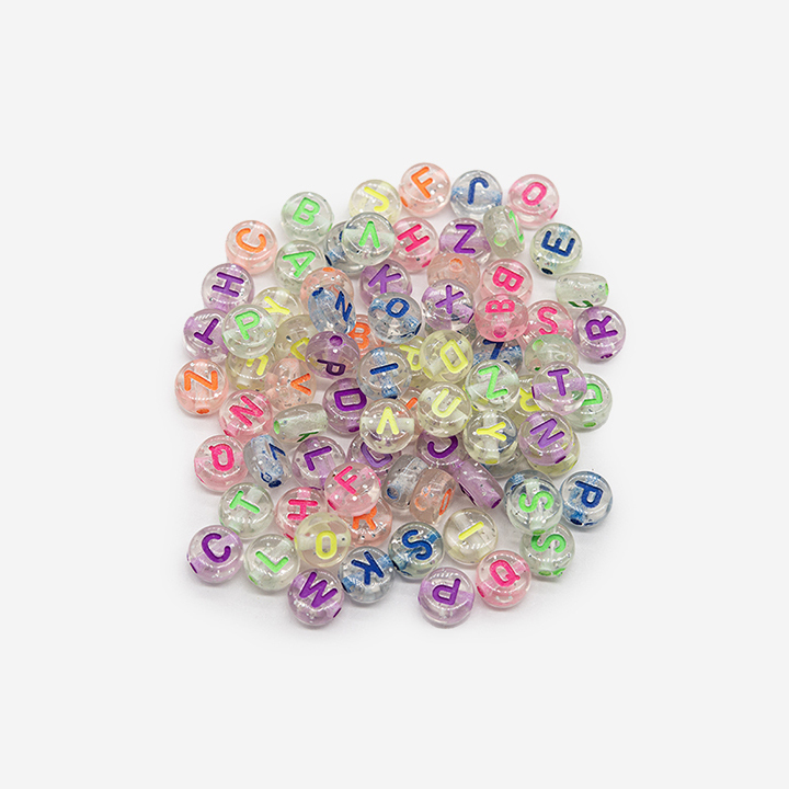 Круглые прозрачные бусины с точечными фольгированными вкраплениями с разноцветными буквами английского алфавита из акрила с боковым отверстием 1,5мм, микс цветов. Размер 6,7мм, толщина 3,8мм.