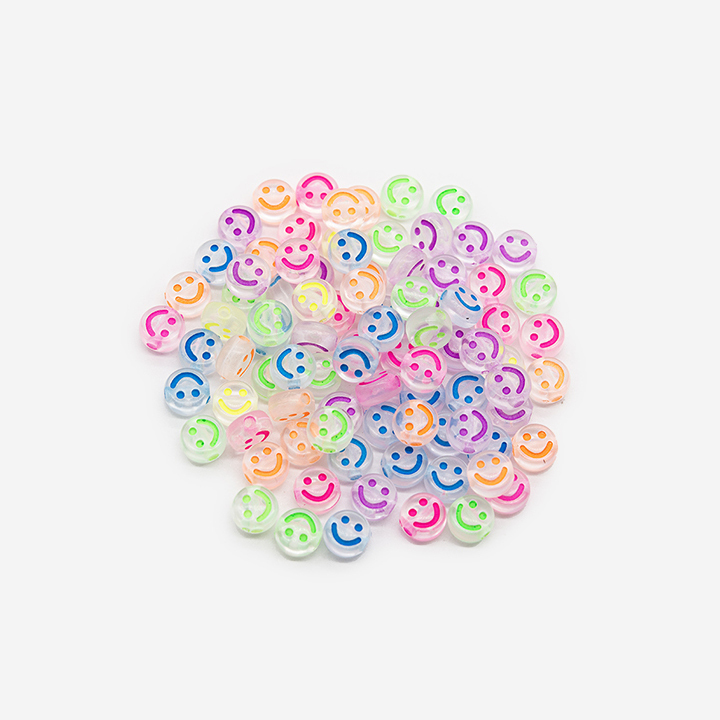 Круглые прозрачные бусины с разноцветными улыбками из акрила с боковым отверстием 1,5мм, микс цветов. Размер 6,7мм, толщина 3,8мм.