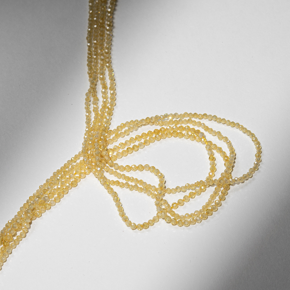 Бусины изготовлены из кубического циркония(он же фианит) - лабораторно выращенного камня, который широко используют в ювелирной промышленности, как аналог бриллиантам - за его высокую способность преломлять свет и прочность.