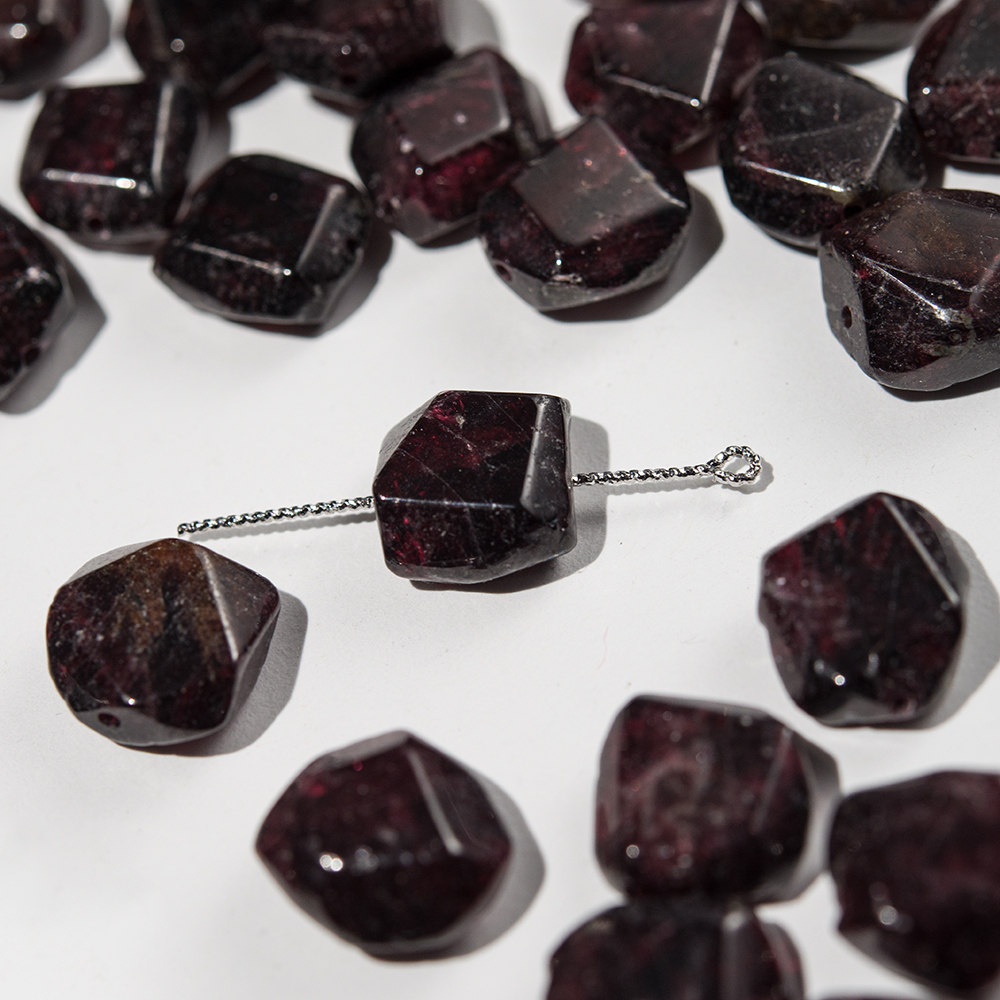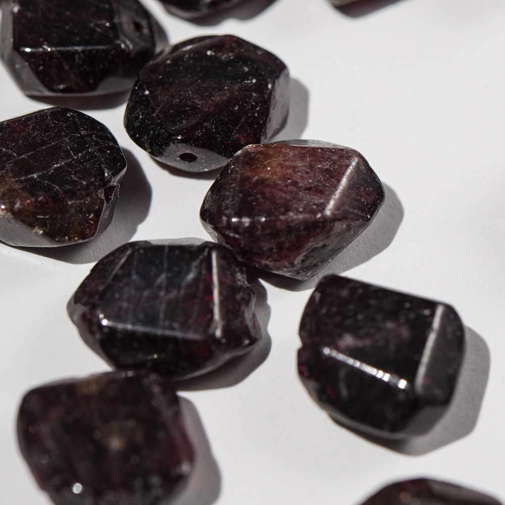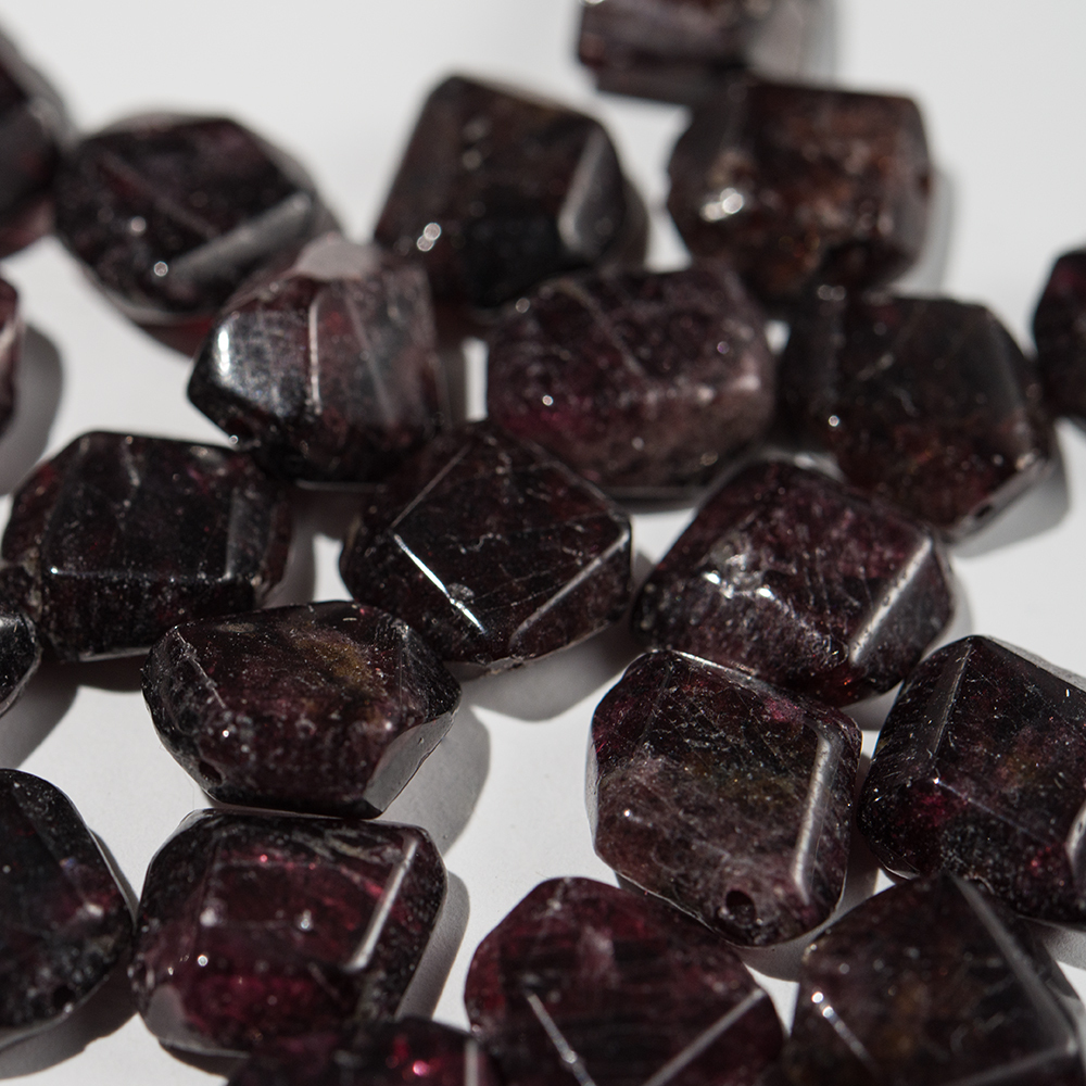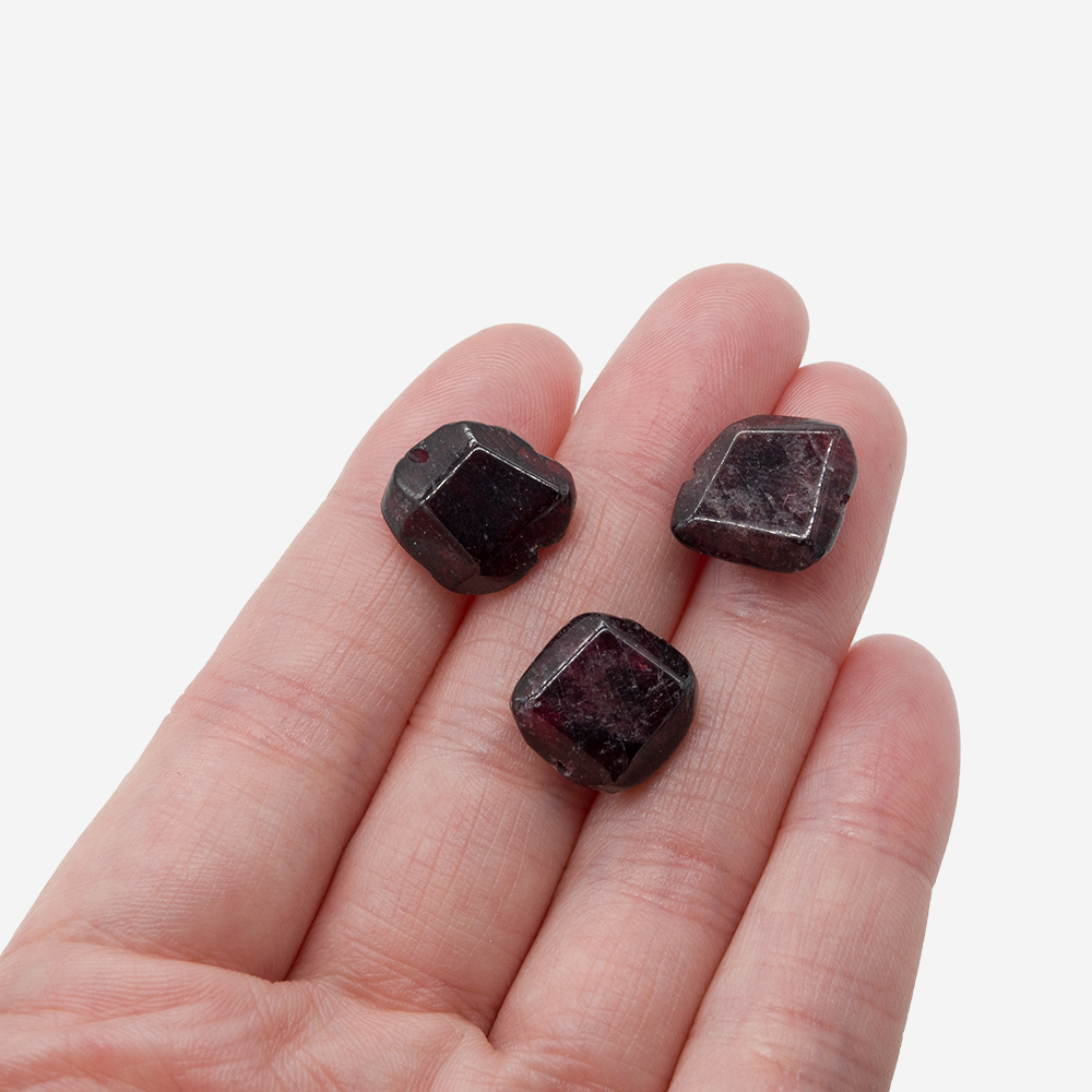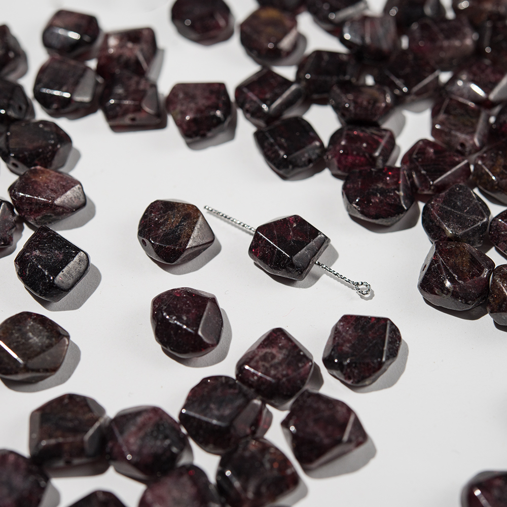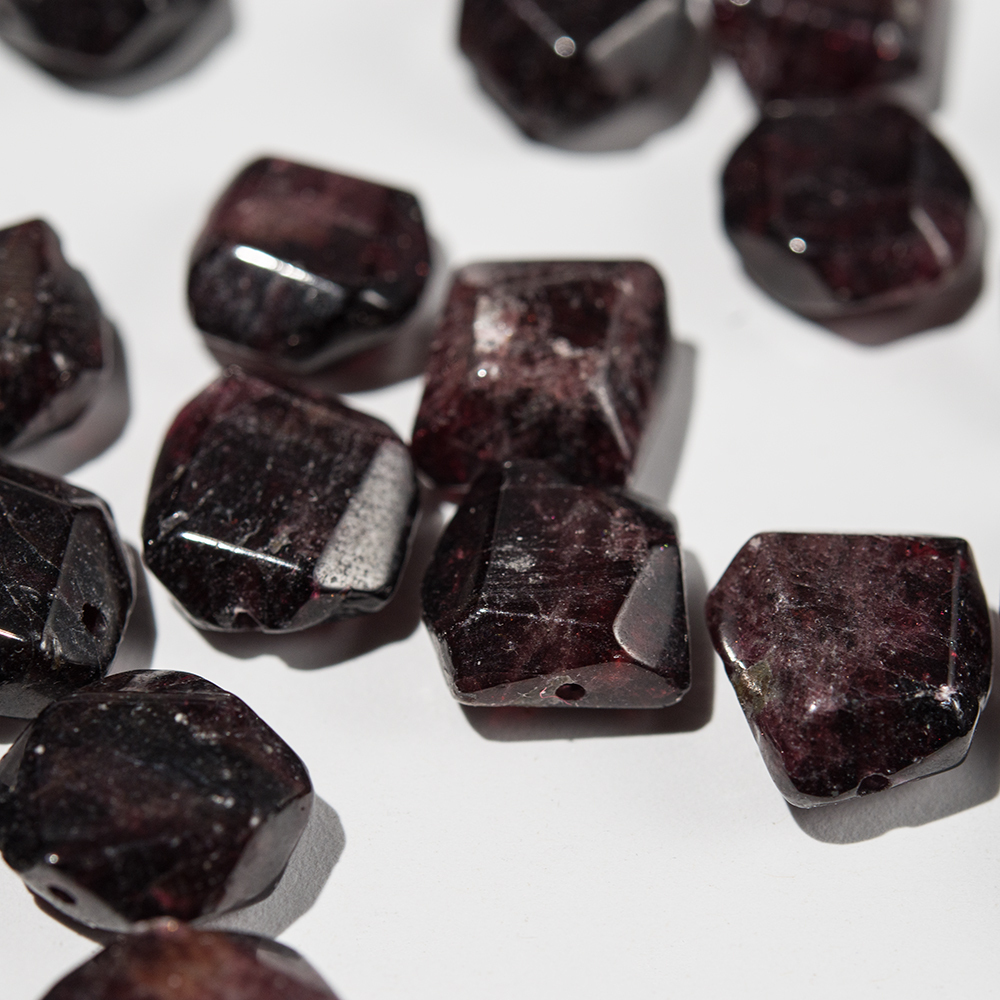 Обратите внимание! Бусины с гранями неправильной формы в виде плитки, изготовлены из натурального граната - на срезах видны природные неровности камня, микротрещины, сколы, возможно смещение отверстия, присутствуют вкрапления разных оттенков характерных минералам кварцевой группы.