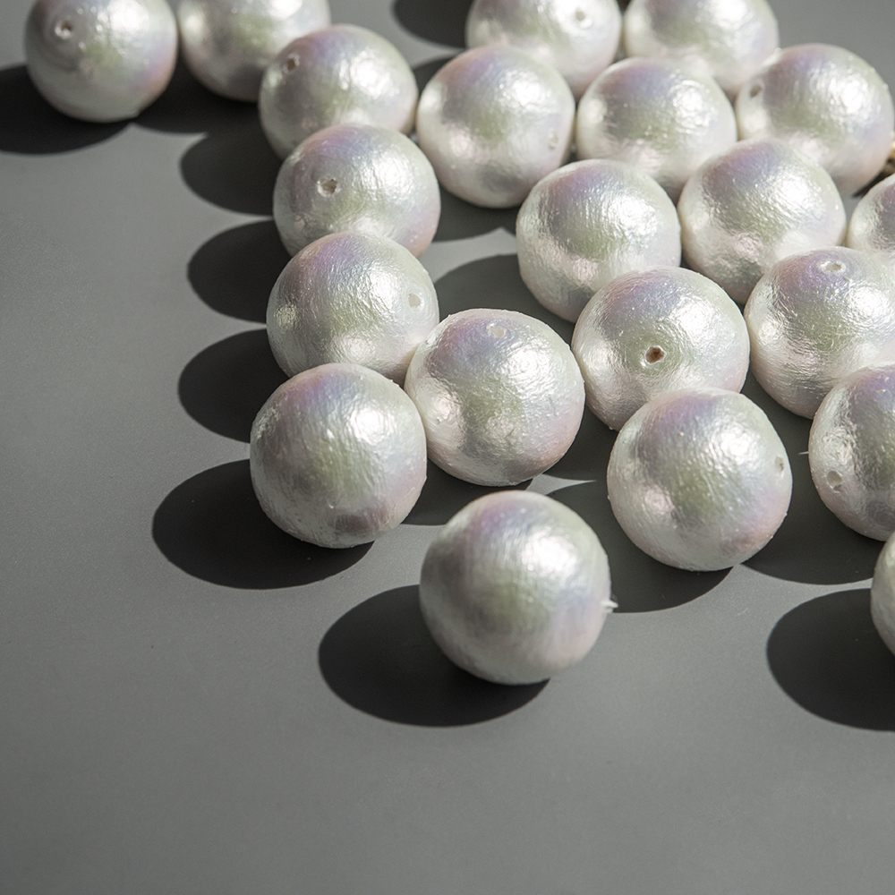Бусины хлопкового жемчуга отличаются невероятной легкостью, так как состоят из спрессованных хлопковых волокон, окутанных жемчужным покрытием. Жемчужины обладают аутентичной, немножко неровной поверхностью, что придает им особый шарм.