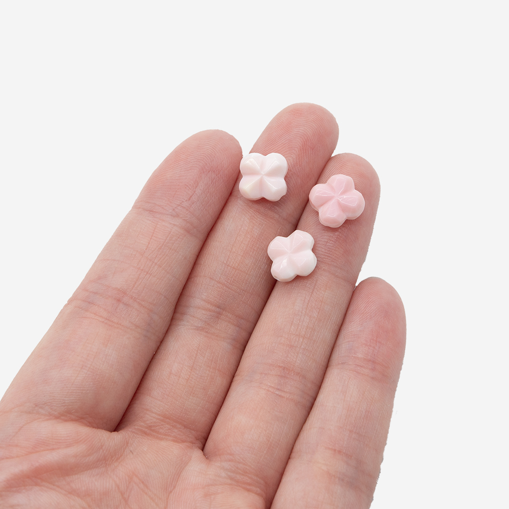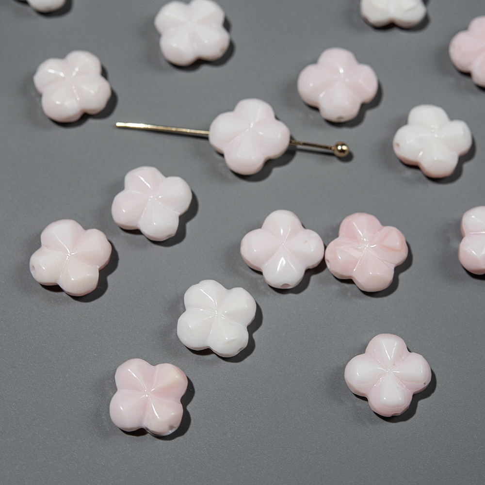 Бусины в форме клевера из раковины розовой королевской ракушки - ценного панамского моллюска. Оттенок цветов очень нежный, от молочно-белого до персикового и розового.