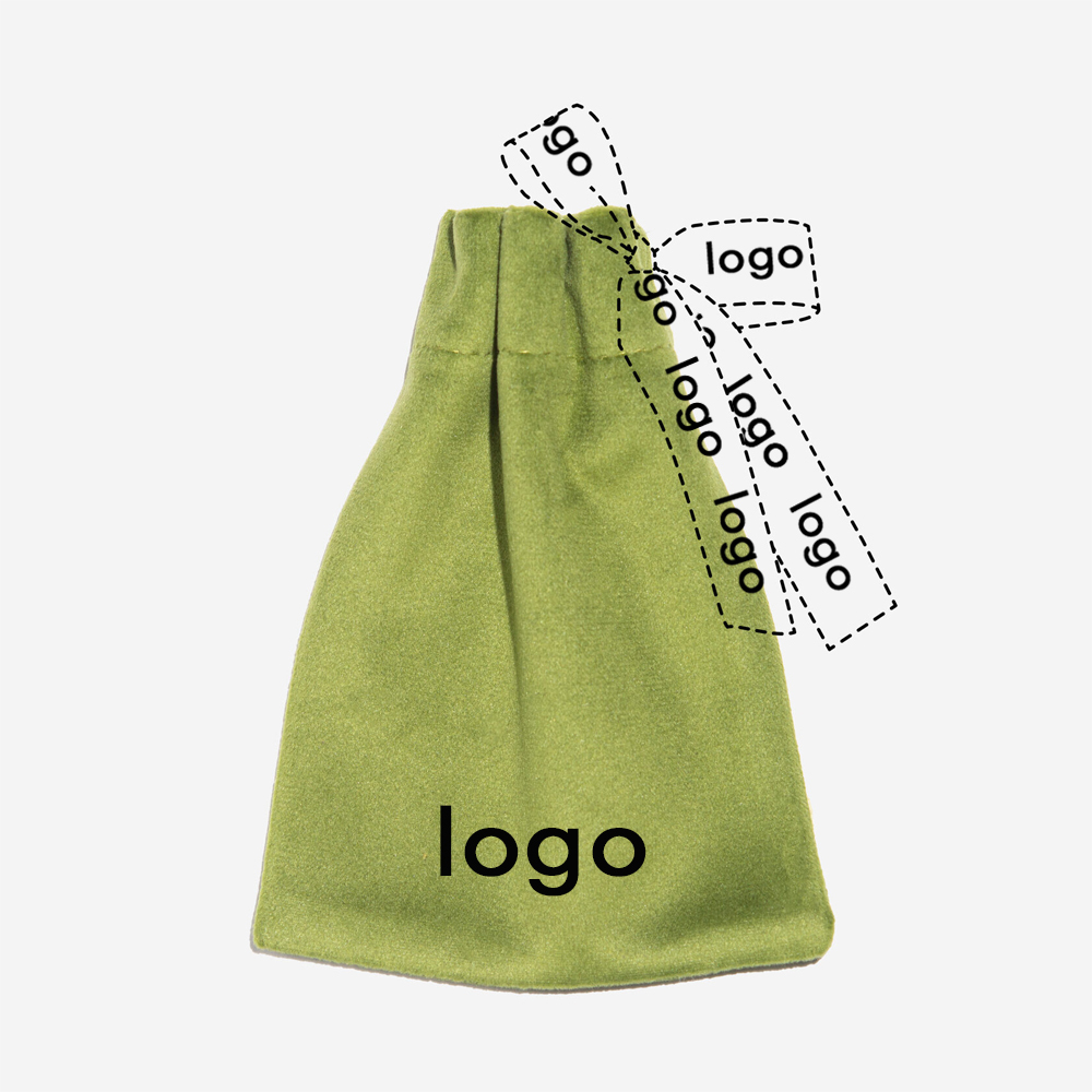 Мешочек из велюра в оттенке "Светло-зеленый", украшенный лентой, на мешочек и ленту мы можем нанести Ваш логотип или любую надпись.