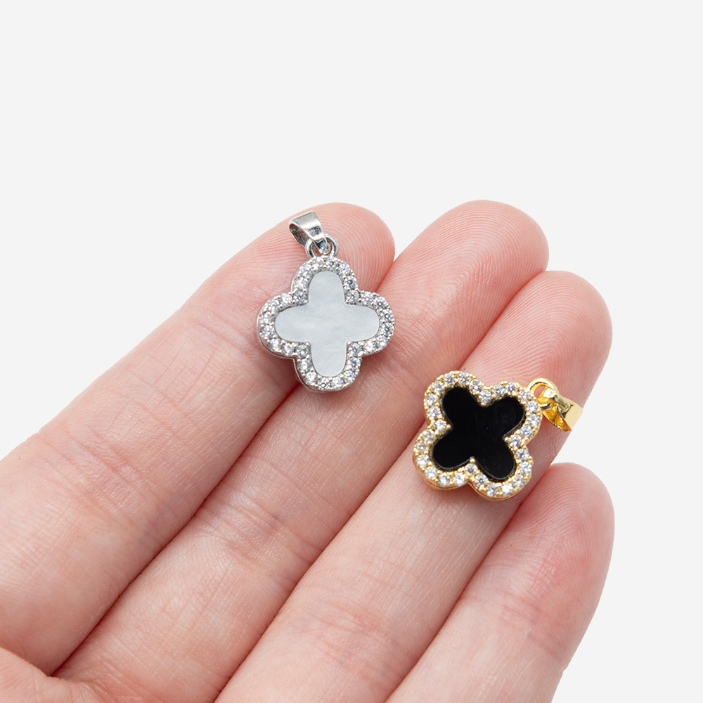 Подвеска с бейлом "Клевер", 16,2*14мм, фианиты, перламутр, керамика, родирование. На керамической и перламутровой вставках защитная пленка от царапин.