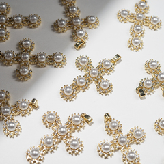 Подвеска с бейлом "Крест", хрустальный жемчуг, фианиты, 39*27,5мм, родирование