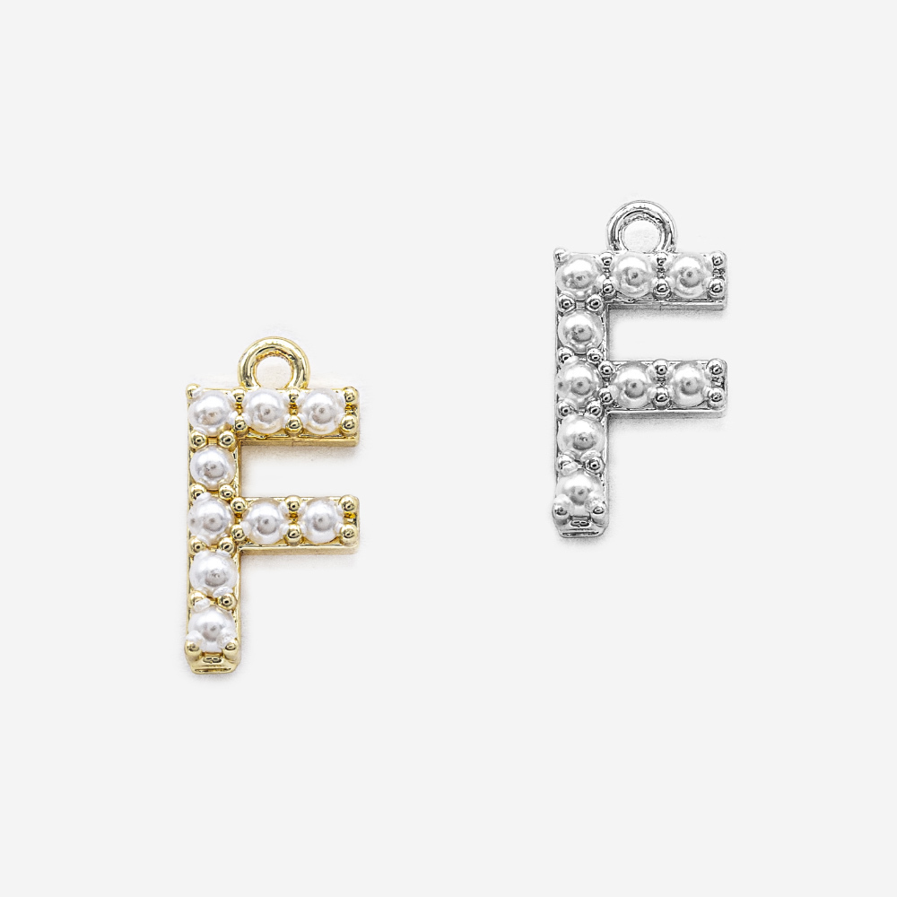 Подвеска в форме латинской буквы "F", инкрустирована искусственными жемчужинами, размер подвески 14*7,2мм (размер указан вместе с колечком).