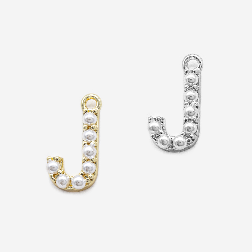 Подвеска в форме латинской буквы "J", инкрустирована искусственными жемчужинами, размер подвески 13,5*7мм (размер указан вместе с колечком).