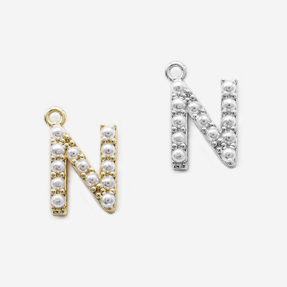 Подвеска в форме латинской буквы "N", инкрустирована искусственными жемчужинами, размер подвески 14,6*9мм (размер указан вместе с колечком).