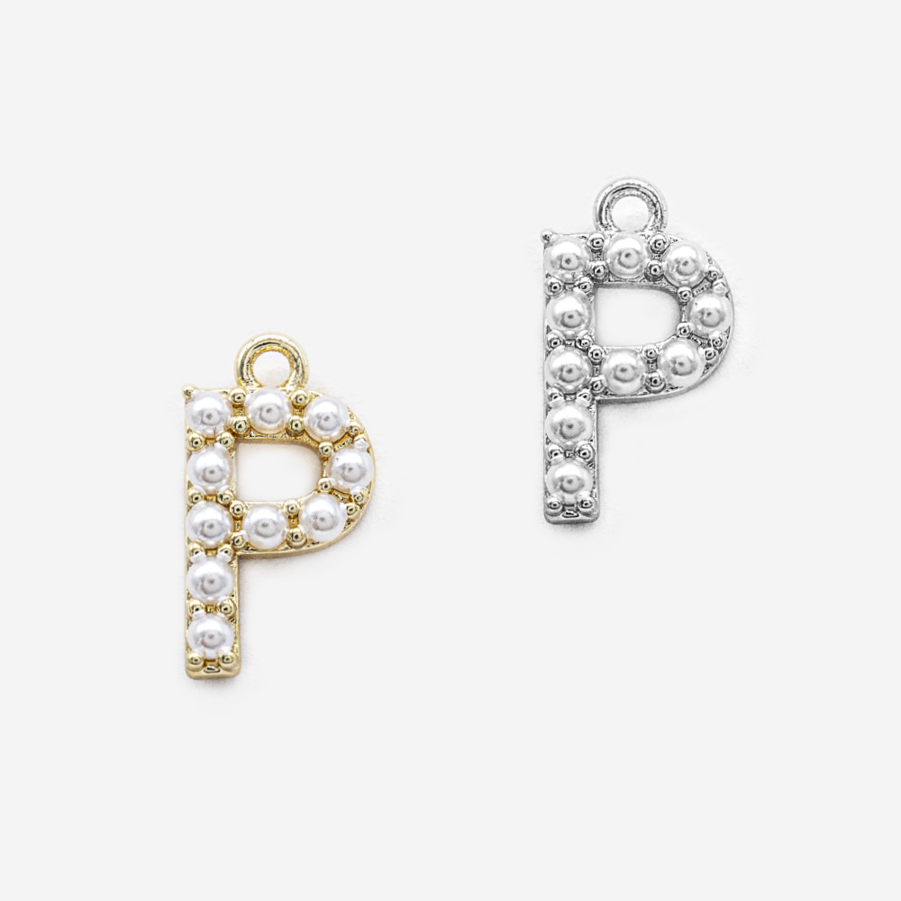 Подвеска в форме латинской буквы "P", инкрустирована искусственными жемчужинами, размер подвески 14*7,7мм (размер указан вместе с колечком).