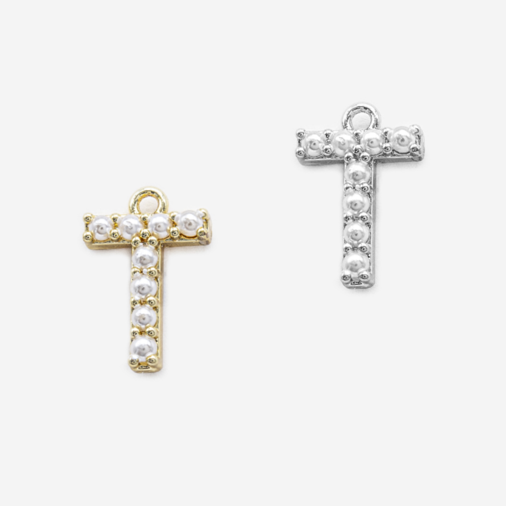 Подвеска в форме латинской буквы "T", инкрустирована искусственными жемчужинами, размер подвески 14*9,5мм (размер указан вместе с колечком).