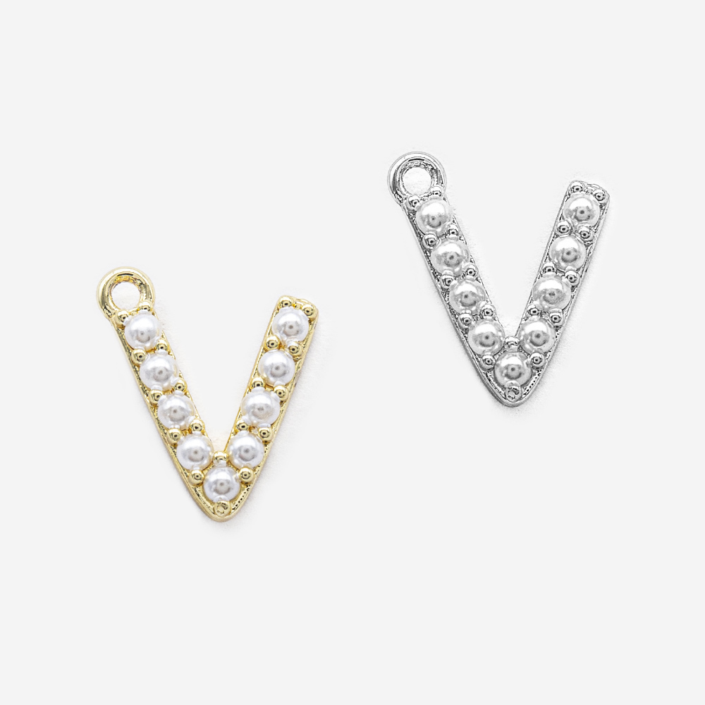 Подвеска в форме латинской буквы "V", инкрустирована искусственными жемчужинами, размер подвески 13,5*11мм (размер указан вместе с колечком).