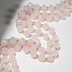 Розовый кварц натуральный в форме кубика. Цвет бусин усилен ярко-розовой нитью в тон.