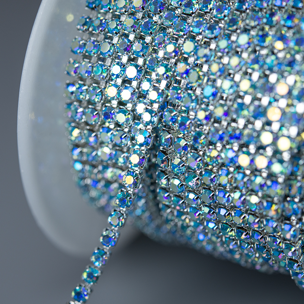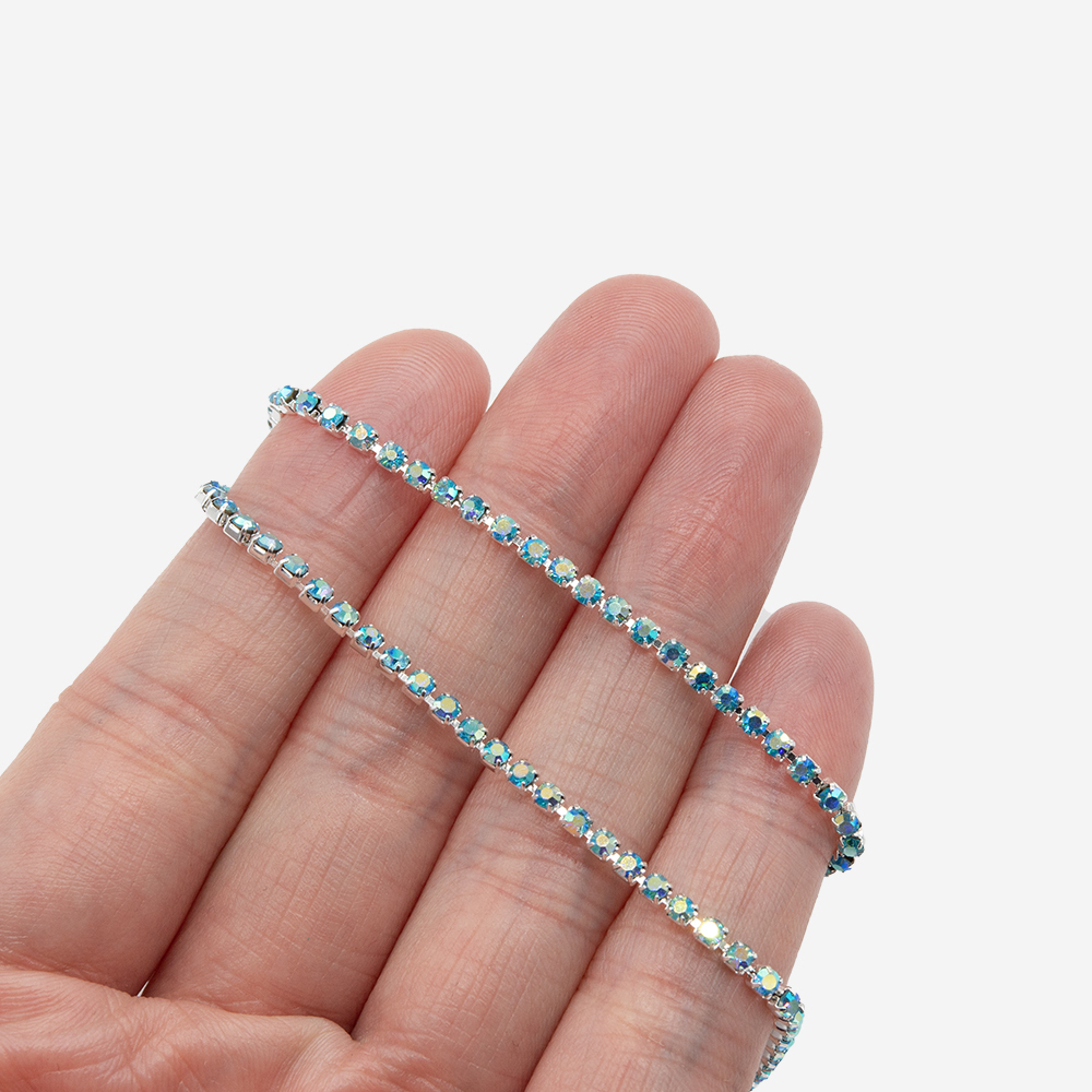 Стразовая цепь с голубыми кристаллами и синим напылением в серебристых цапах. Размер 2мм.
