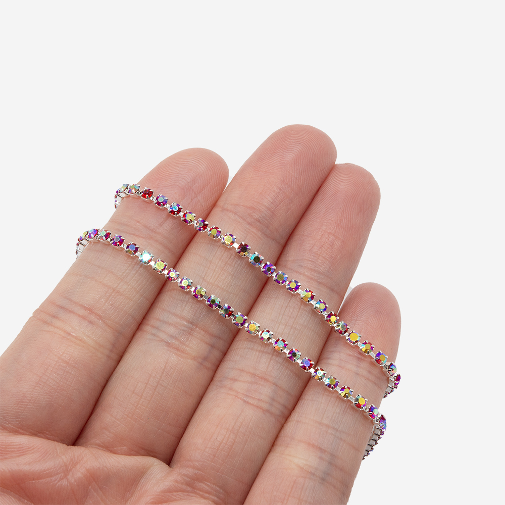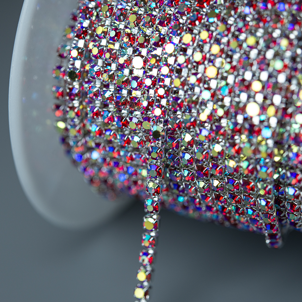 Стразовая цепь с красными кристаллами и желто-синим напылением в серебристых цапах. Размер 2мм.