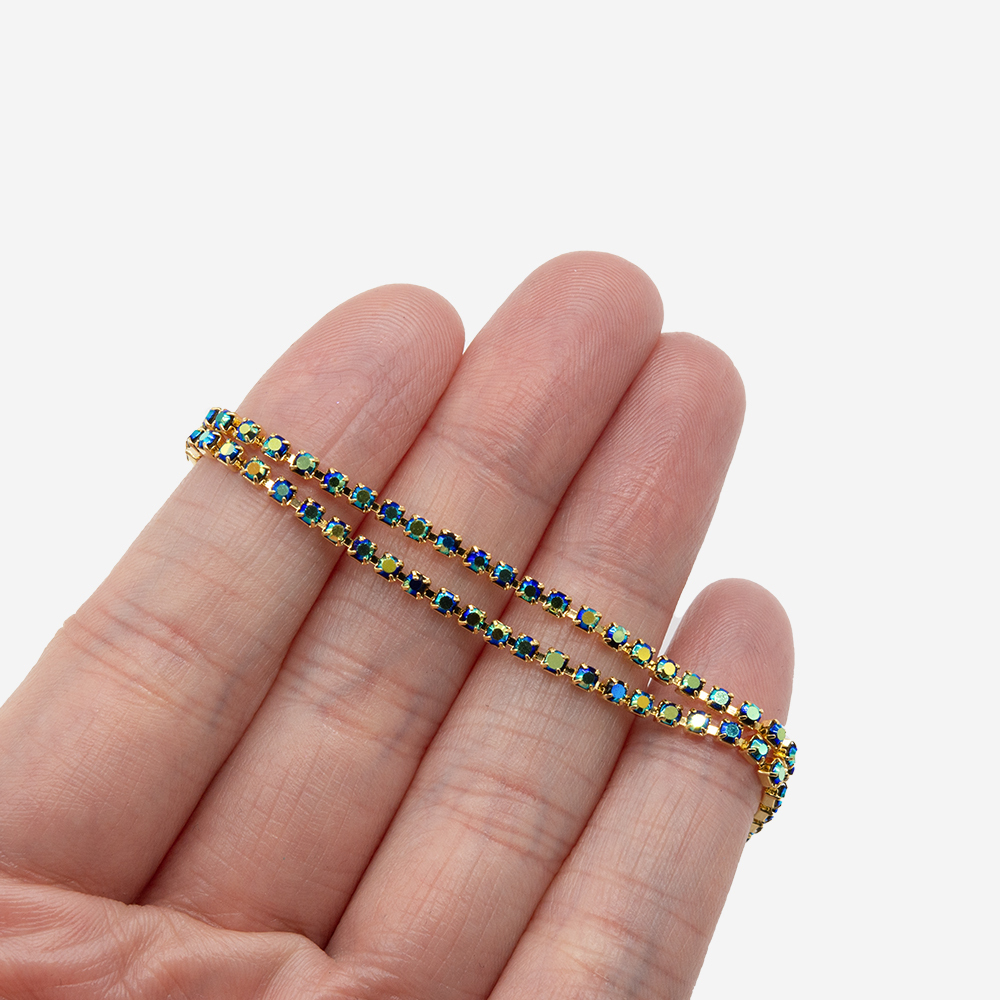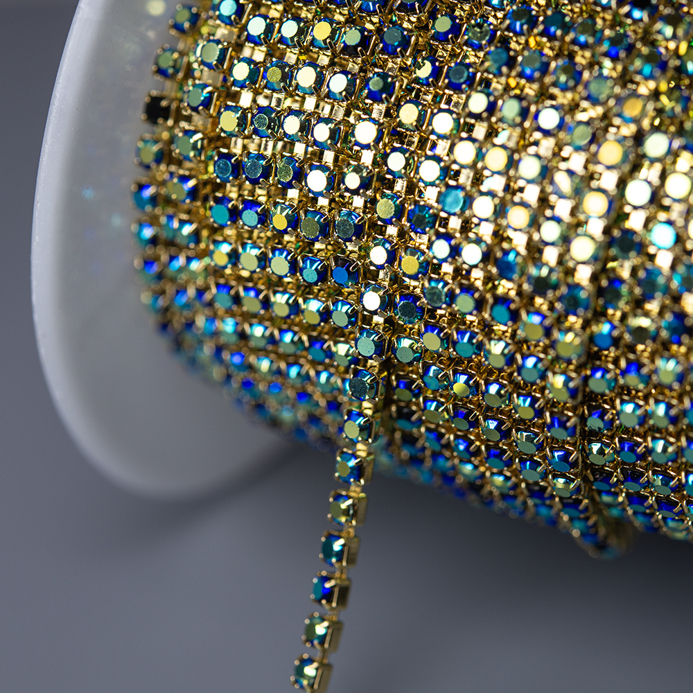 Стразовая цепь с синими кристаллами и зелено-желтым напылением в позолоченных цапах. Размер 2мм.