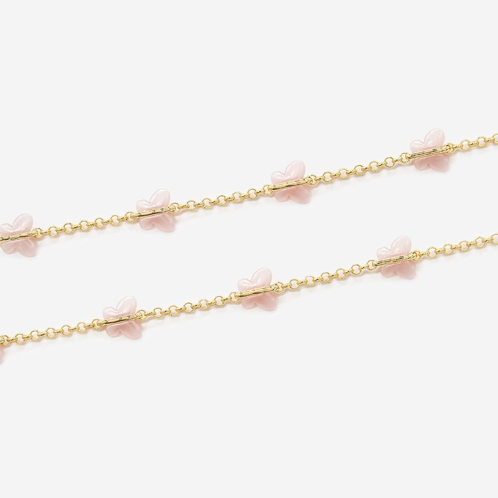 Цепь с дополнительным защитным покрытием. Размер звена - классическое Ролло - 2,5мм, розовая бабочка из акрила 9,5мм, позолота.