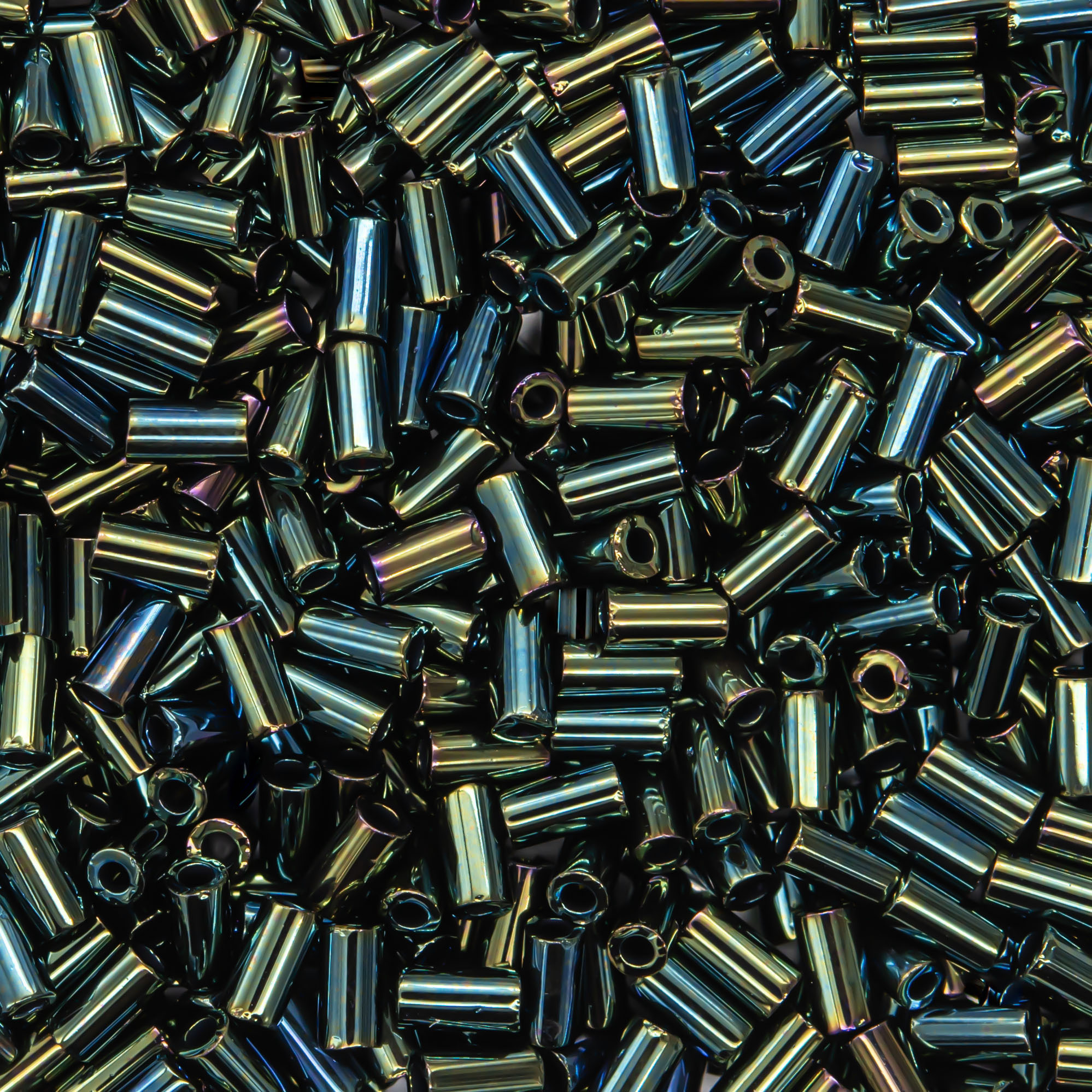Японский бисер TOHO Bugle - стеклярус - оттенок №84 Metallic Iris Green/Brown (Зеленый ирис/коричневый) - металлизированный, непрозрачный глянцевый, металлический зеленый.