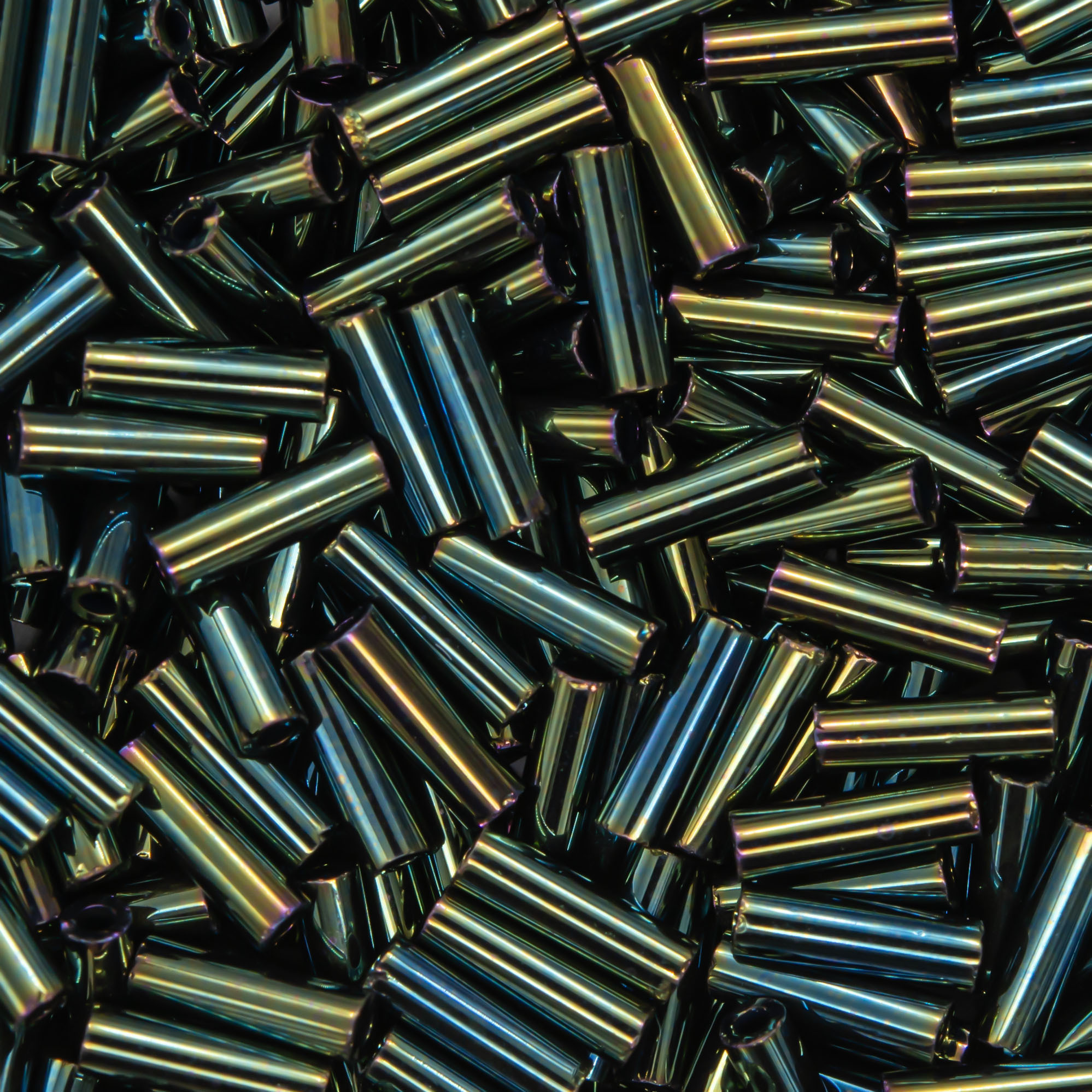 Японский бисер TOHO Bugle - стеклярус - оттенок №84 Metallic Iris Green/Brown (Зеленый ирис/коричневый) - металлизированный, непрозрачный глянцевый, металлический зеленый.