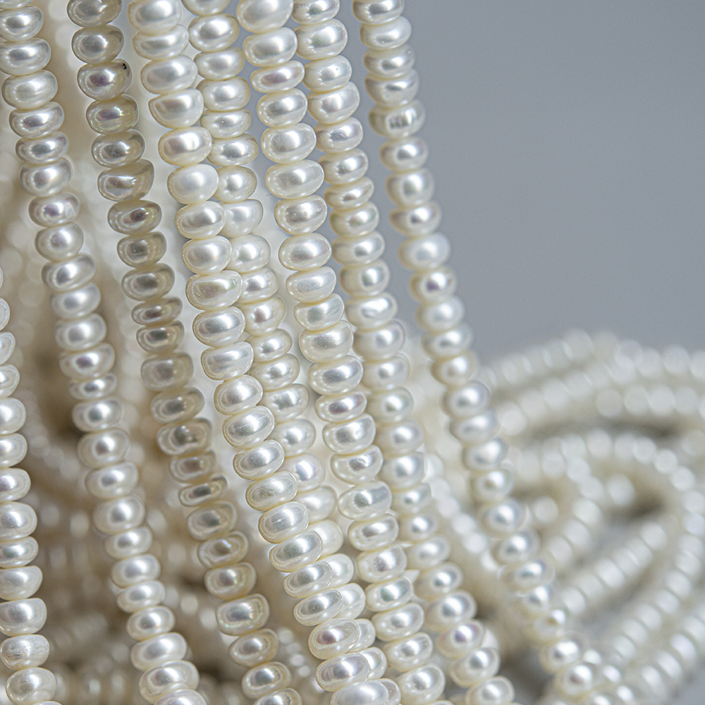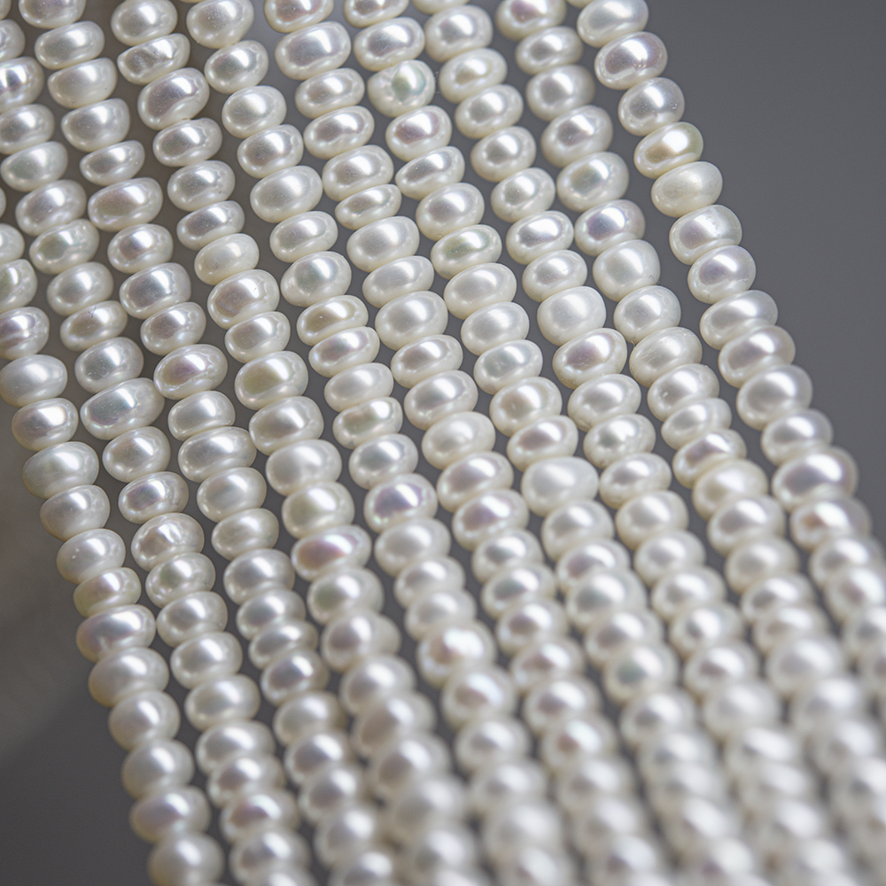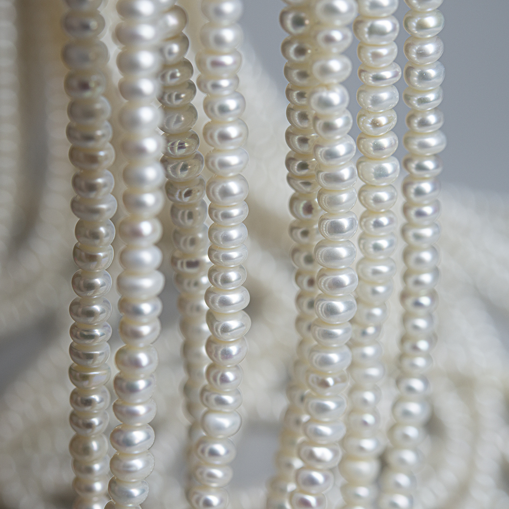 Бусины с плотным слоем перламутра яркого свечения. На некоторых жемчужинах могут присутствовать тоненькие полоски линии роста, области сниженного сияния перламутра. Практически идеальный жемчуг с отличной калибровкой по длине и ширине.