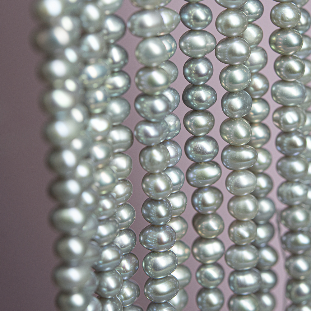 Бусины с плотным слоем перламутра яркого свечения. Единичные жемчужины могут иметь полосочки естественного роста, области сниженного сияния перламутра.