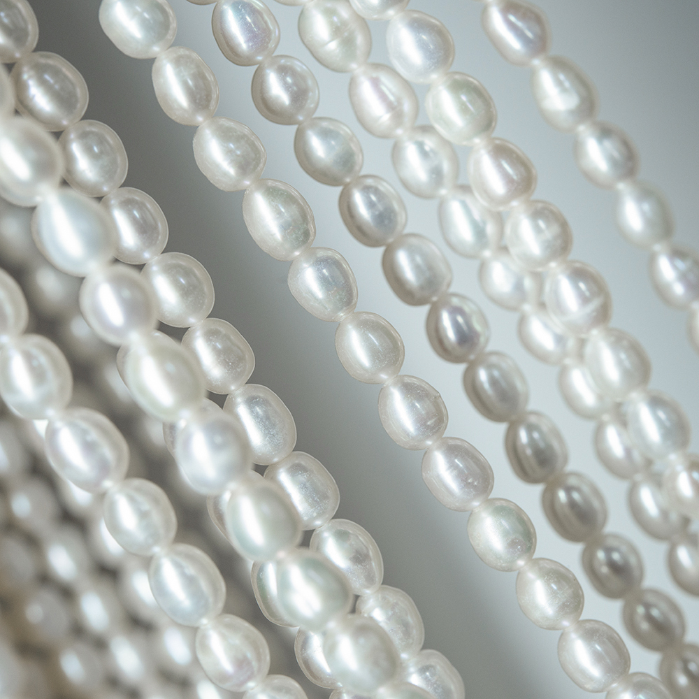 Бусины вытянутой формы с плотным слоем перламутра яркого свечения. На некоторых жемчужинах могут присутствовать тоненькие полоски линии роста, области сниженного сияния, пятнышки природного происхождения. Оттенок белый с интенсивным сиянием перламутра.
