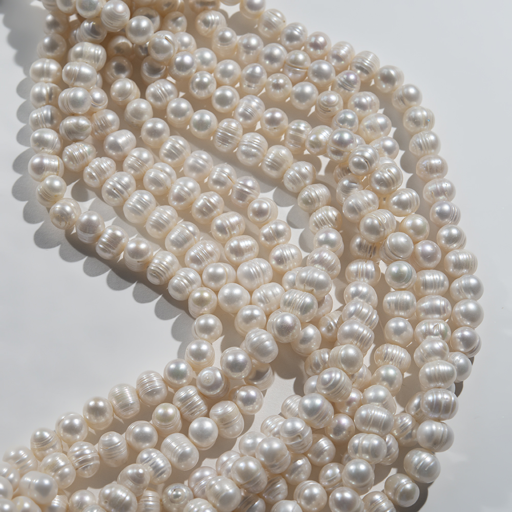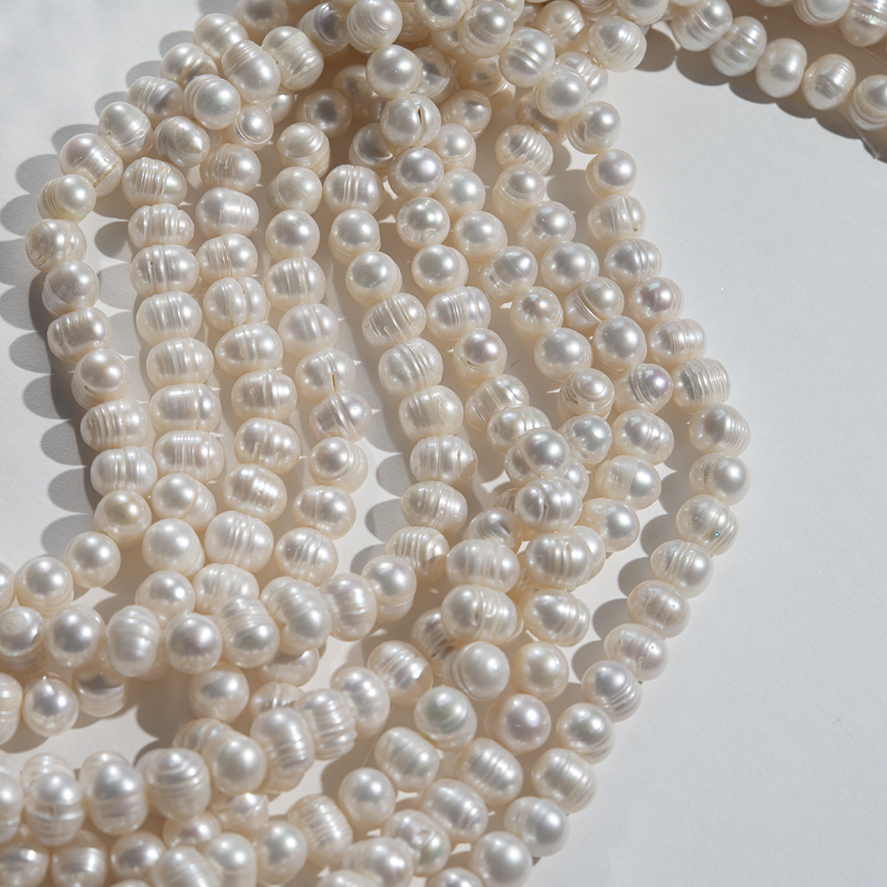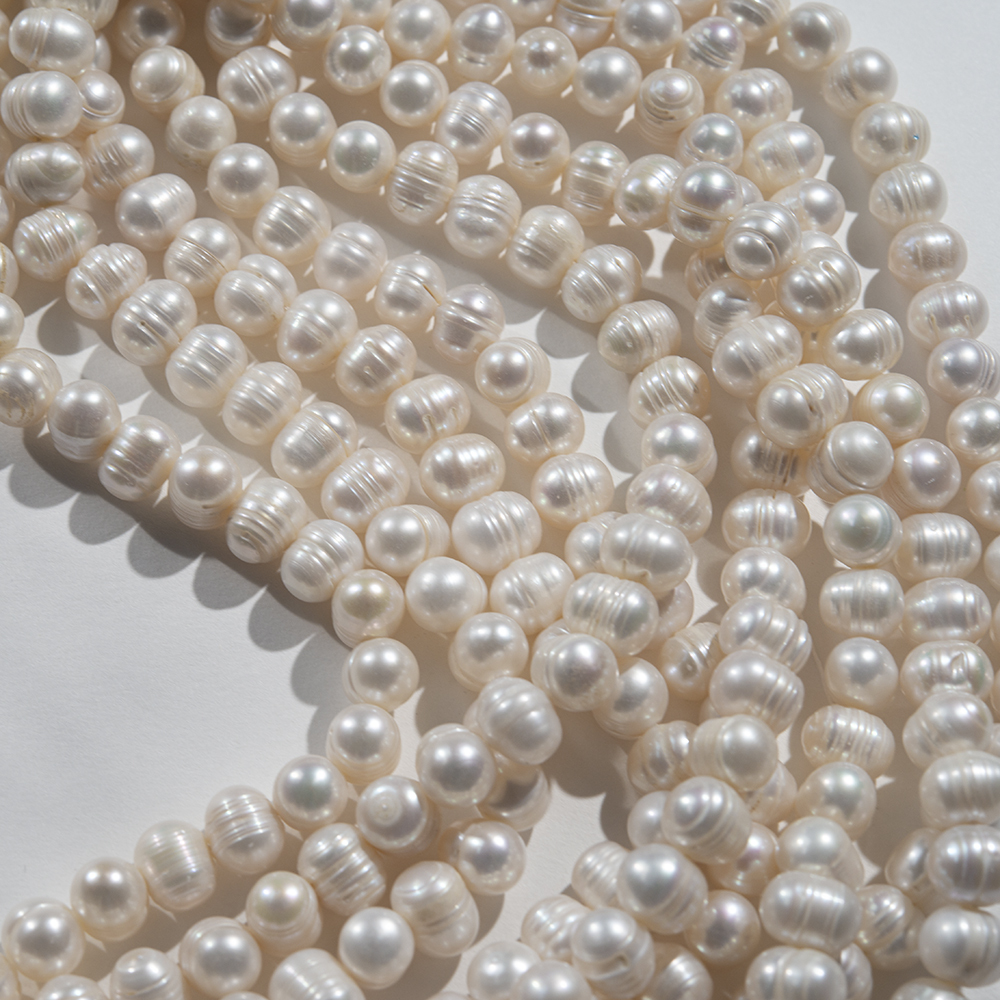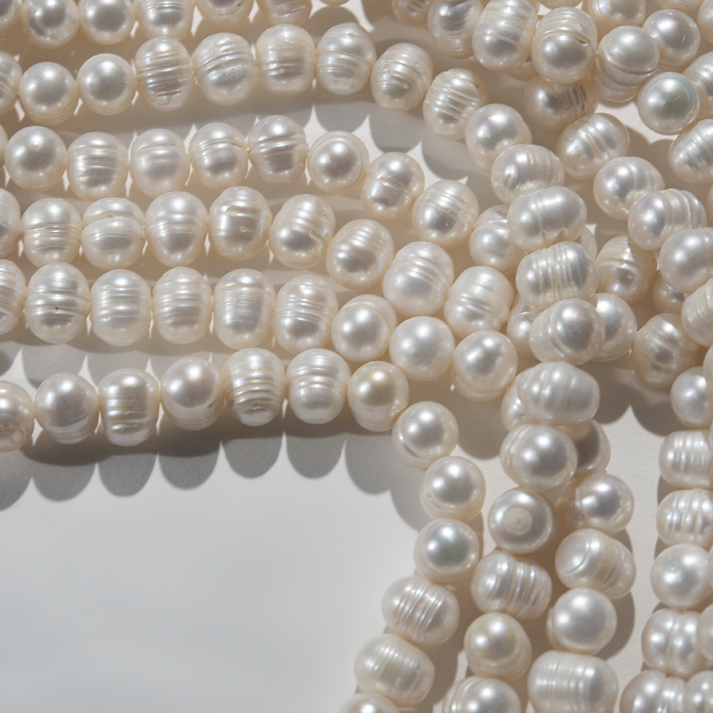 На поверхности бусин присутствуют ярко выраженные природные бороздки роста жемчужин, "ободки", потертости.
