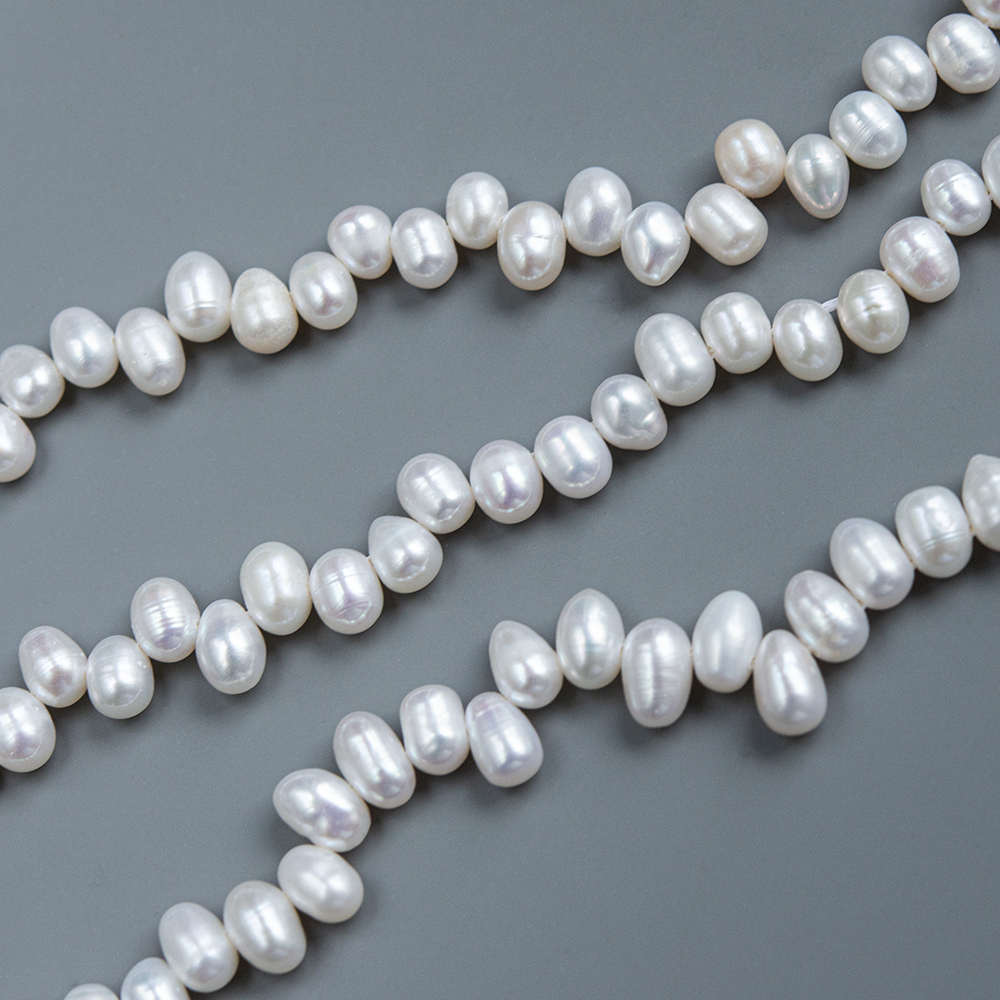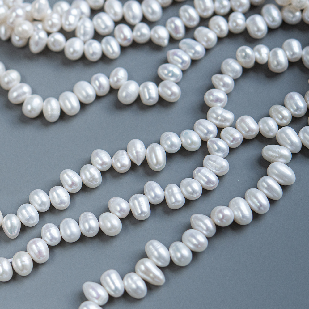 Культивированный жемчуг белого цвета со смещенным отверстием. Размер жемчужин около 5*7-7,5мм.